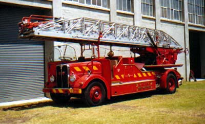 | Merryweather Turntable Ladder on Maudslay Regent III half-cab chassis assembled by Maudslay in May 1952. The appliance was made for the Canberra Fire Brigade, although it never actually saw service there. The vehicle ended up in Sydney with the NSW Fire Brigades, entering service in 1954 at Sydney HQ Station. It was superceded here in 1969 by a TGM chassied Merryweather (a twin went to Canberra at the same time as this city's first TL), and after overhaul went to Newcastle were it stayed until 1988, then it came to the Museum. |