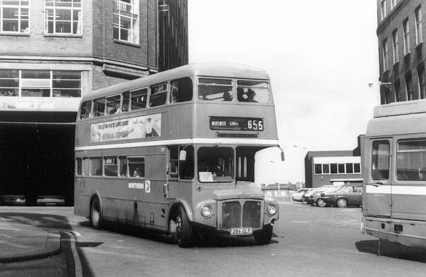 Date: 15th June 1979 Event/Location: Worswick Street Bus Station, Newcastle-upon-Tyne. Description: Northern General 3129, the prototype front entrance Routemaster originally RMF 1254 with London Transport, retained its front upper deck quarter-drop opening windows whereas the fifty Northern General vehicles had plain, non-opening windows at the front. Photo © Peter Newman 1979 and used with permission.