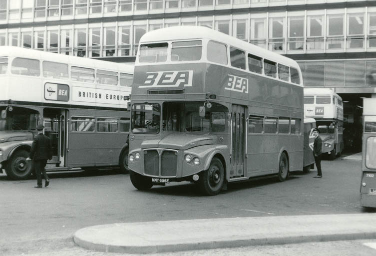 NMY 656E was the first BEA Routemaster Coach to be repainted in BEA's then new tangerine and white livery, still very new when this photo was taken at the West London Air Terminal in Gloucester Road on 1st September 1969. This coach would later become RMA 13, and is now preserved. |