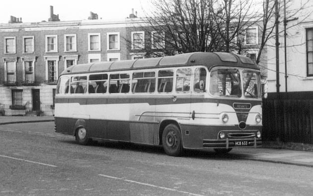 Date: 14th February 1971 Event/Location: Malden Crescent, Kentish Town Description: Seen on the day before Decimalization Day, Tiger Coaches of Ramsey (Hunts) HCB633, 1957 AEC Reliance MU3RV1500 with Yeates C41F coachwork, new to Batty Holt of Blackburn. Photo © Peter Newman 1971/2003 and used with permission.