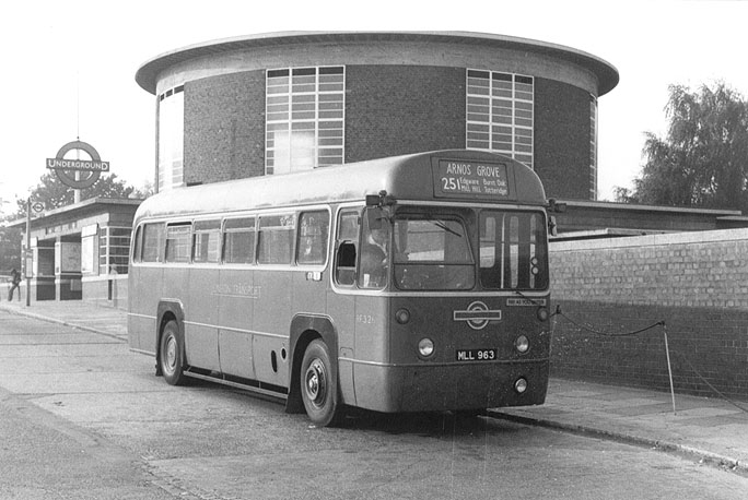 Date: 11th October 1969 Event/Location: Arnos Grove Underground Station Description: Two icons of London Transport design: Holden's classic Arnos Grove Station, and RF326, AEC Regal IV Type 9821LT. Photo © Peter Newman 1969/2003 and used with permission. |