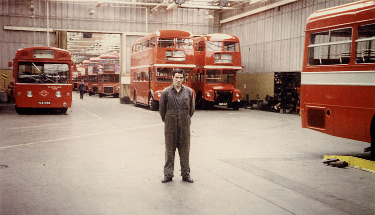 This is Derek at Aldenham in the summer of 1968, with new Merlin MB 314 and overhauled RMs behind him. In the background are RMs (note the first is in original condition), an RF and an RT in for overhaul.