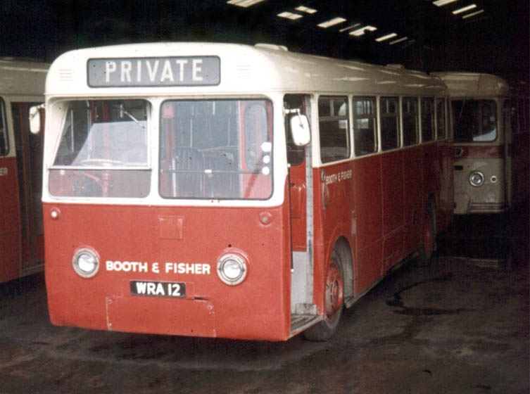 Location & date: Halfway Depot, 1977 Description: 1955 AEC/Park Royal Monocoach MC3RV056, B45F. One of two Monocoaches operated by Booth & Fisher, the well known South Yorkshire independent. This one is preserved and resides at the Sheffield Bus Museum. Photo © John Law 1977 and used with permission.