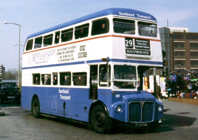 | Former Green Line 1965 AEC Routemaster RCL 2256 seen while in the ownership of Southend Transport as number 121. Following rear end accident damage the RCL was fitted with a standard RM-type open platform. |