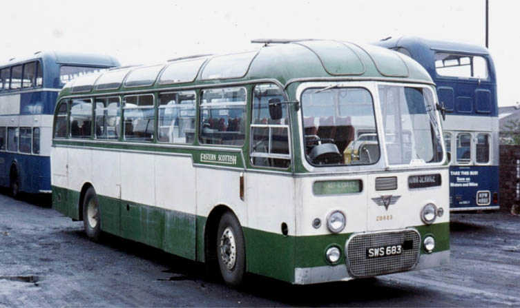 Description: 1959 AEC Reliance 2MU3RV2298 with Alexander C38F body, Eastern Scottish ZB683. The Lodekka in the right of the picture is KPW 486E.