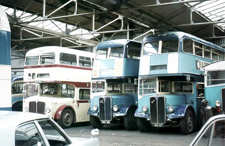 | Some very interesting vehicles in Viceroy's depot at Saffron Walden. HER 27 and HER 28 are Weymann bodied AEC Regent IIIs 6811A083 & 6811A084, new in October 1949 to Pest Controls Ltd of Bourn, Lincs. VJF 213 is former Leicester City Transport 213, 1959 AEC Bridgemaster B3RA050, Park Royal H41/31R, sold to Moore of Saffron Walden in 1971. The firm's AEC Matador is just visible in this view. |