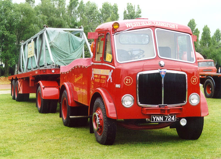 Date: 27th May 2001 Event/Location: AEC Society Rally, Newark Showground Description: Westfield Transport 1958 "Tin Front" Mk III Mandator coupled to a flatbed trailer loaded with part of a knitting machine, typical of the loads hauled by this unit.