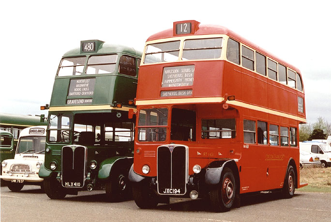 Description: RT1431, with 5-bay Cravens body, parked next to 'Country Area' RT593 and SMK783F,1968 Bedford CALV8811338 LT Works Ambulance 1492B, with bodywork by Lomas.