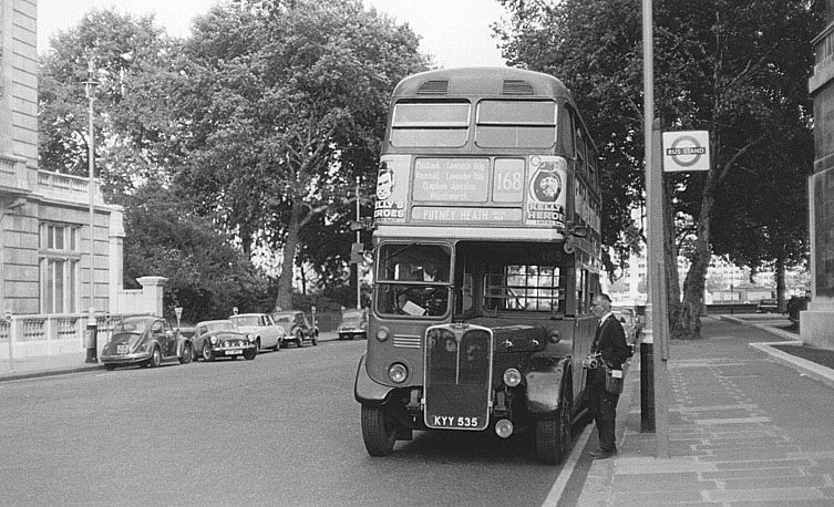 Description: The "eyebrows" bus, not sadly the original RT2776 but RT1708 at the Westminster stand on route 168.The roof mounted ventilators can be seen clearly, while the conductor chatting to his driver shows off his Gibson ticket machine.