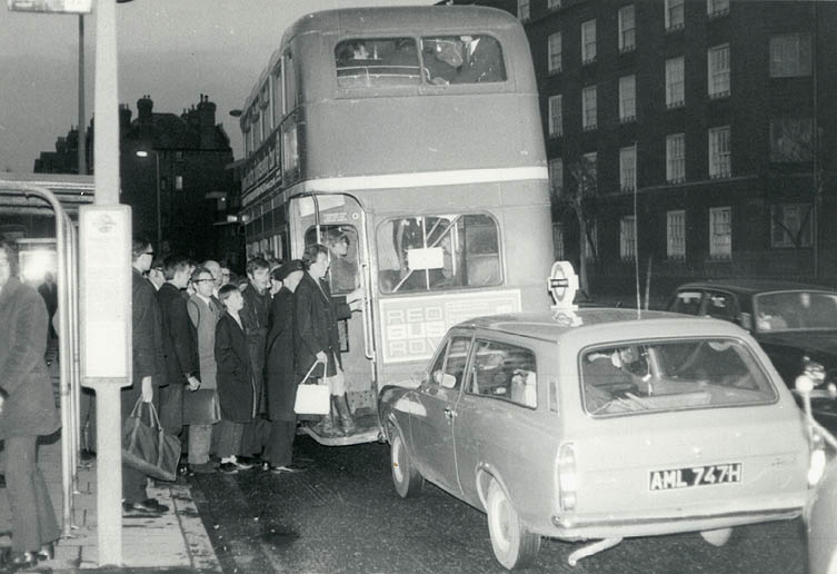 | In this shot, taken at the first stop in Lower Clapton Road, the conductor at the stop of the stairs has just called down to the inspector that the bus is well and truly full (with enthusiasts, mostly!) and so the inspector is putting his arm across to prevent the lady from boarding - hopefully she wasn't intending to travel all the way to Stratford and could catch an alternative route! |