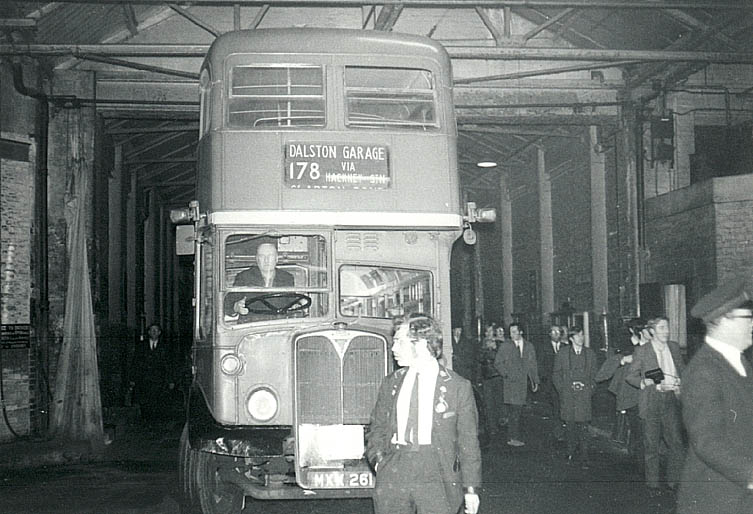 | Next, the driver (standing in front) has handed the bus over to a member of the garage staff who drove it onto an inspection bay. The LT staff were very co-operative and allowed enthusiasts right into the garage to take photos. Having given everyone a few minutes to fire their flashguns an official then very politely asked everyone to leave the garage, which everyone did. |