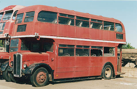 | Former Country Area RLH 21 (MXX 221, with RT 3572 MLL 882 behind) seen in May 1999 at Steele Realty and Investment Co, Elk Grove, south of Sacramento. This was where RLH 21, ex University of California, Davis, had resided for many years, looking a little out of place in amongst the farming implements, wagons and tractors that are also on the site. RLH 21 was in a red livery with white band between decks; the interior was complete but minus a couple of windows; it had no engine. [ 1952 AEC Regent III 9613E6949 ] |