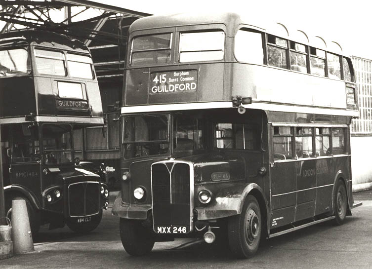 (MXX 246) photographed outside Guildford (GF) Garage, with Green Line RMC 1484 in shot. [ 1952 AEC Regent III 9613E6972 ]