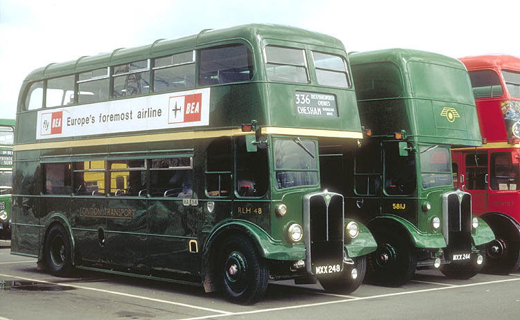 (MXX 248) alongside the preserved uniform store 581J (ex RLH 44) photographed at Addlestone during the Cobham Bus Rally of 1991. [ 1952 AEC Regent IIIs 9613E6970 and 9613E6952 ]