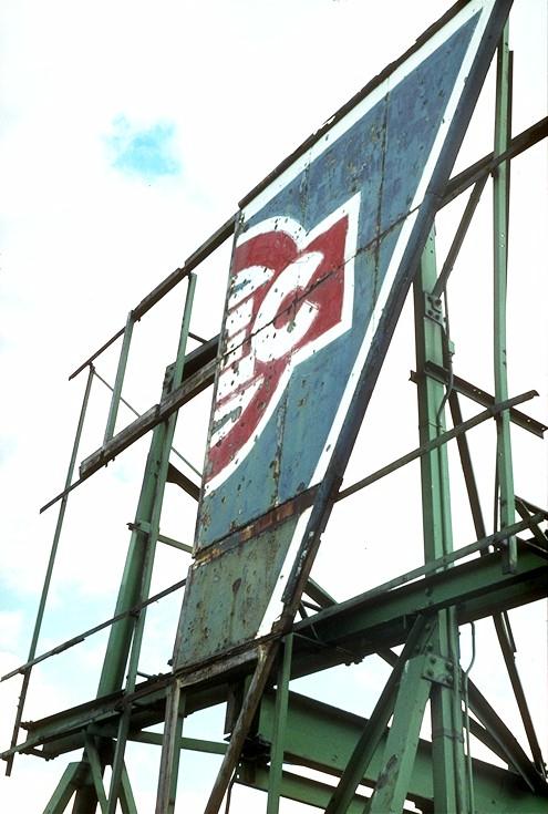 Date: February 1981 Event/Location: AEC Works, Southall, Middlesex Description: AEC sign at Park Road / Glade Lane end With its panels missing and the remains rusting away, the once proud Blue Triangle sign awaits the end. Perched high above the Works it was clearly visible from trains passing on the Western Region tracks. The substantial gantry supporting the sign can be seen.
