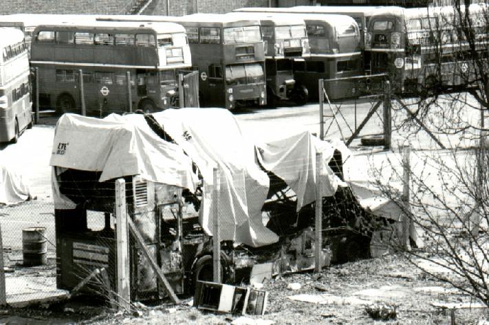Description: Withdrawn LT RMs and DMSs reside at AEC Southall. In the foreground more burnt out remains of another Metrobus.