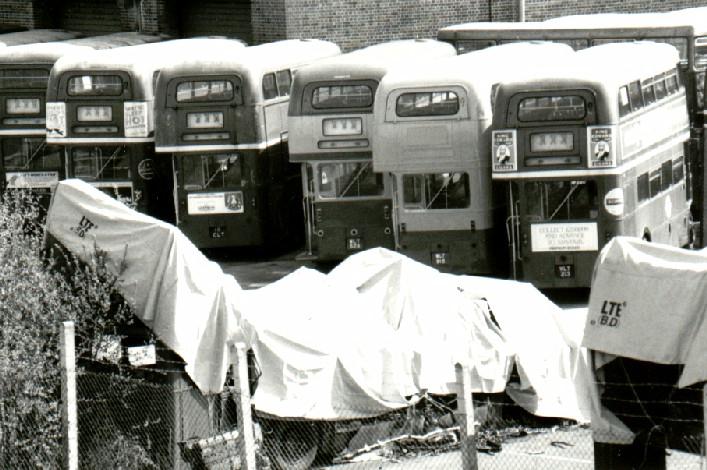 Description: Southall Works are used for rehabilitation of some Routemasters for sale outside London. In the foreground the shrouded remains of a burnt out Metrobus.
